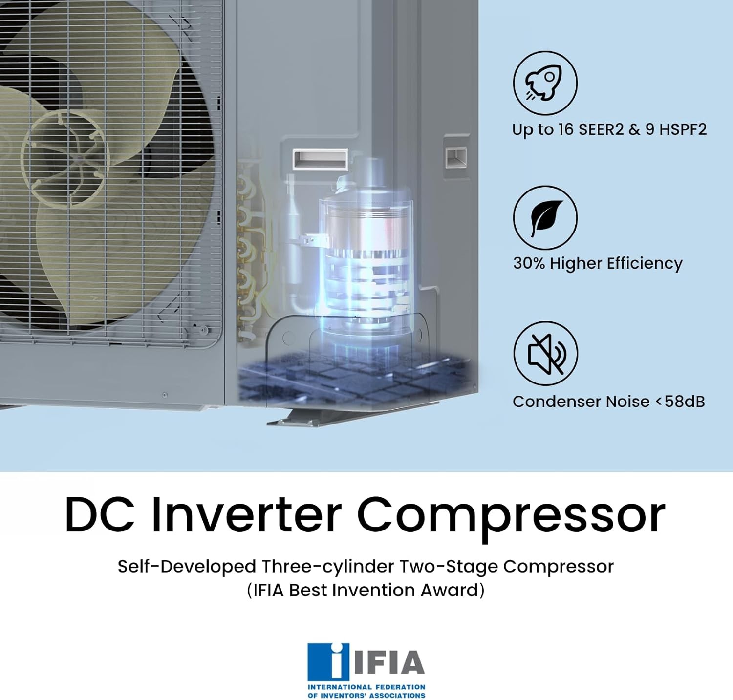 • Self-Developed Compressor: Utilizes a triple-cylinder two-stage rotary compressor and enhanced vapor injection technology; optimizes low-temperature heating; maintains 100% heating capacity at -5℉ and 100% cooling performance at 115℉