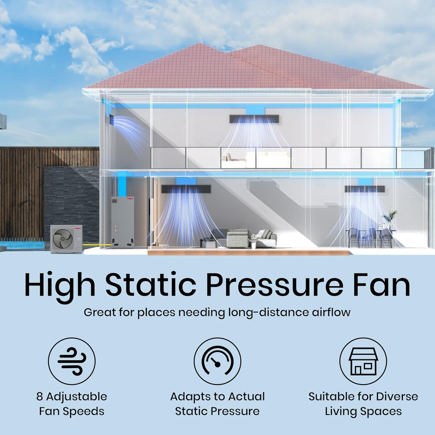 • High Static Pressure Design: The TOSOT unitary central AC adapts to actual static pressure, great for areas requiring long-distance airflow; meets the needs of various living spaces with eight adjustable fan speeds